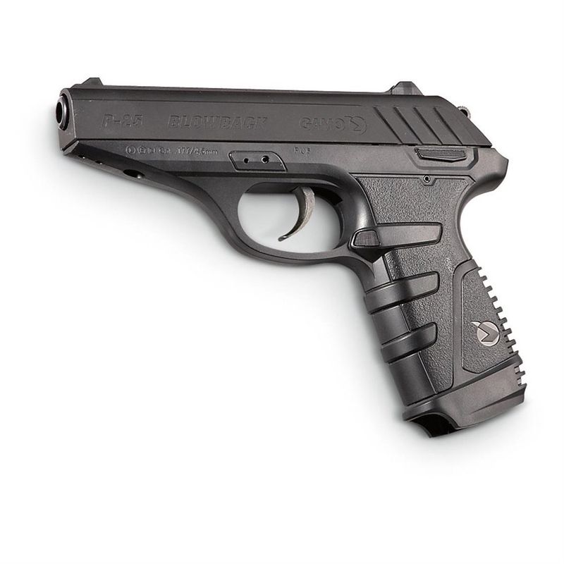 A P 25 possui blowback, mas apesar do que ocorre em armas de extremo realismo, essa pistola de chumbinho não perde força com a ação do slide para trás a cada disparo. Na verdade a Gamo P-25 é uma das pistolas airguns mais fortes que existe, com mais de 3,5 joules de força, 450fps de velocidade e um rendimento de aproximadamente 50 disparos por cilindro de co2 12g.