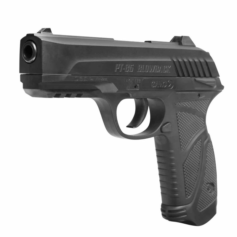 A PT 85 possui blowback, mas apesar do que ocorre em armas de extremo realismo, essa pistola de chumbinho não perde força com a ação do slide para trás a cada disparo. Na verdade a Gamo PT-85 é uma das pistolas airguns mais fortes que existe, com mais de 3,5 joules de força, 450fps de velocidade e um rendimento de aproximadamente 50 disparos por cilindro de co2 12g.