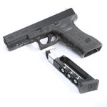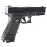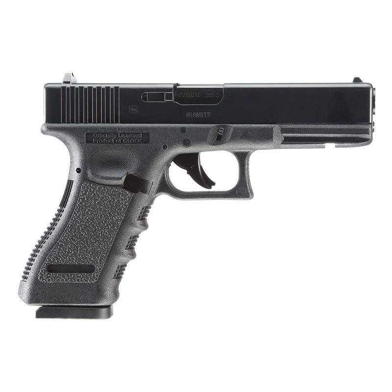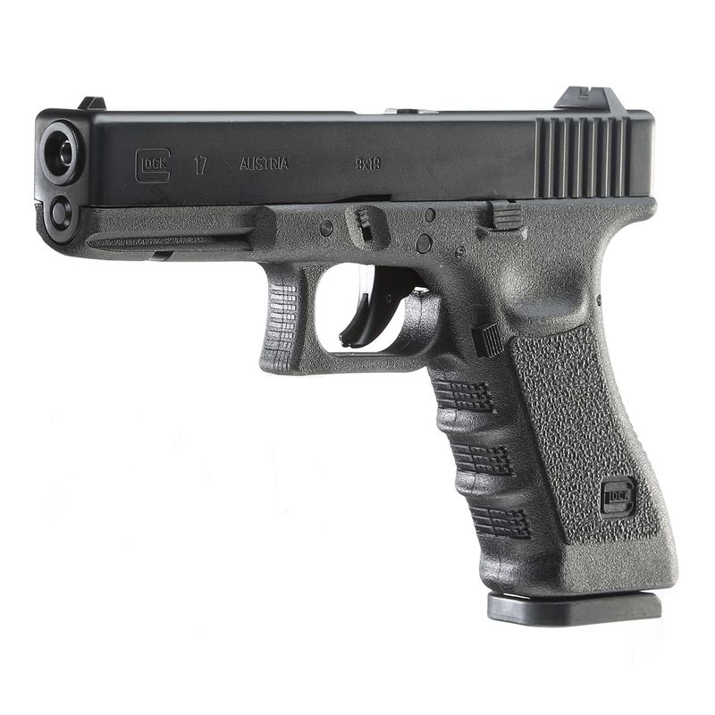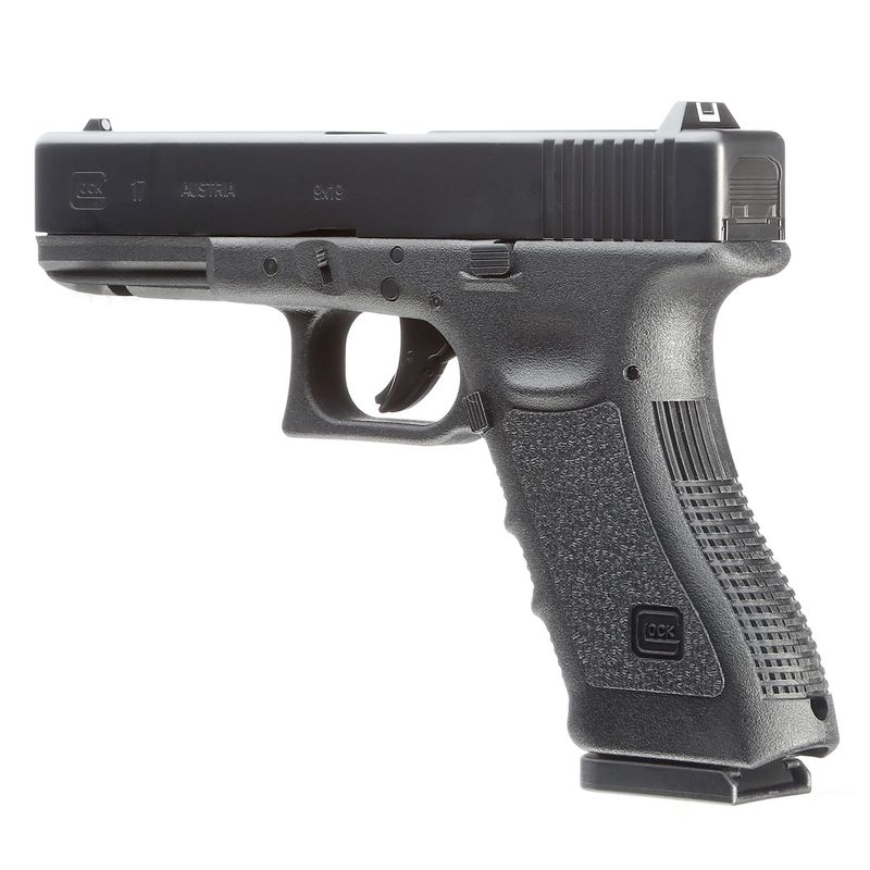 A pistola de ar Glock 17 Geração 3 CO2 vem em um calibre de 4,5 mm — e dispara pellets e esferas de aço. A pistola de ar particularmente detalhada é reproduzida em uma escala de 1/1 e, graças às marcações Glock originais, garante uma impressão muito fiel ao original. As marcações foram gravadas profundamente na lâmina de metal e as marcações Glock moldadas no cabo estão perfeitamente integradas.
