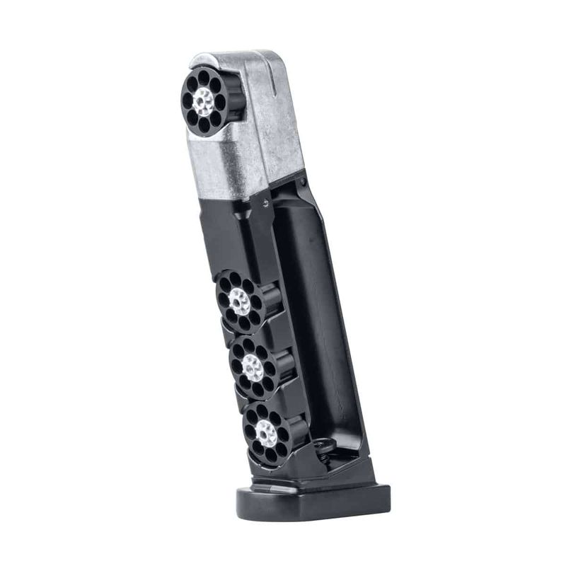 A Glock 17 da Umarex possui magazine com 4 tambores para 8 chumbinhos cada, totalizando uma capacidade de 32 tiros.