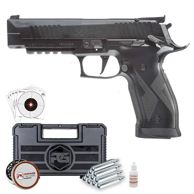 Detalhes da pistola Sig Sauer X-Five CO2: A pistola Sig Sauer P226 X-Five oferece uma velocidade média de 380fps (115m/s) com chumbinhos 4,5mm (.177) de 0,4g de peso.