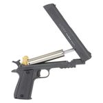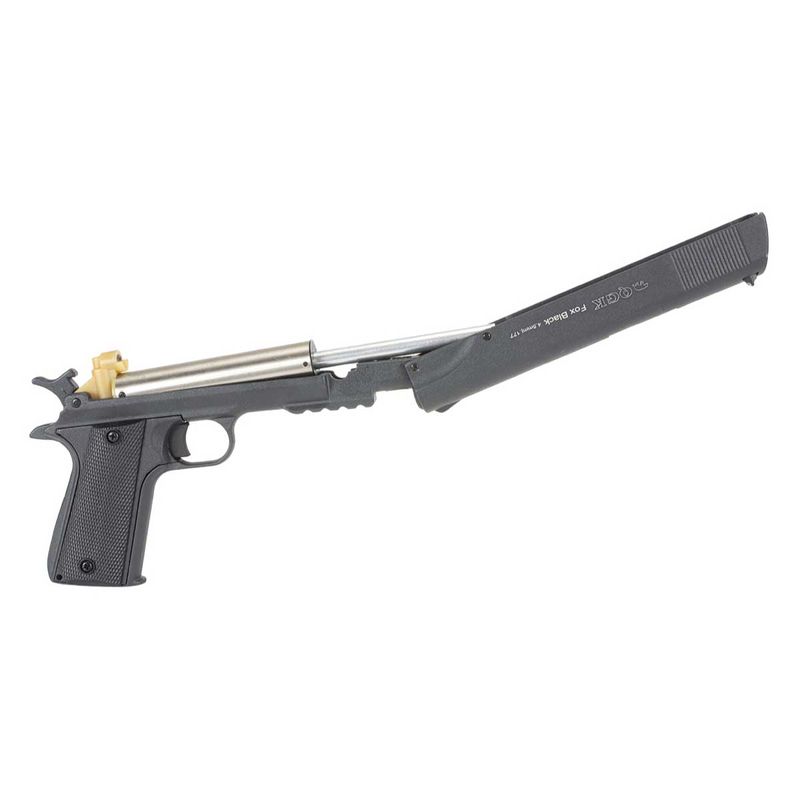 A pistola FOX 1911 BK da QGK utiliza o sistema APC (Ar Pré Comprimido), muito popular em modelos de carabinas de pressão.