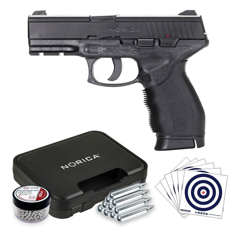 A Pistola de Pressão Norica 24/7 N.A.C. 1701 CO2 4,5mm Kit dispara no modo Semi Automática com velocidade de 450fps - 137m/s e energia de 3,3 Joules Ver mais