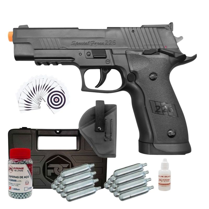 A pistola Sig Sauer P226 X4 Co2 4,5mm possui uma velocidade média de 410fps (124m/s).