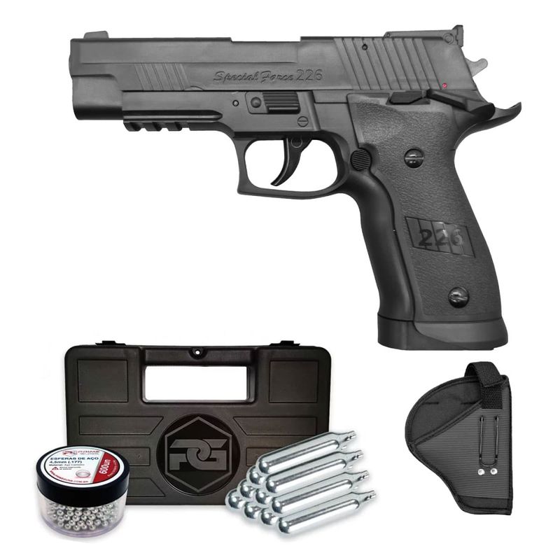 A pistola Sig Sauer P226 X4 Co2 4,5mm possui uma velocidade média de 410fps (124m/s).