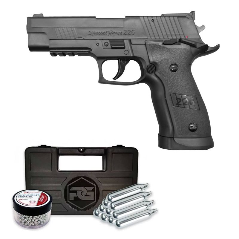 A pistola Sig Sauer P226 X4 Co2 4,5mm possui uma velocidade média de 410fps (124m/s).