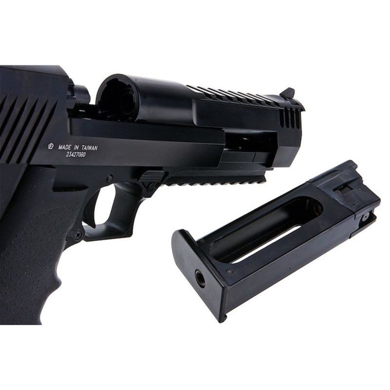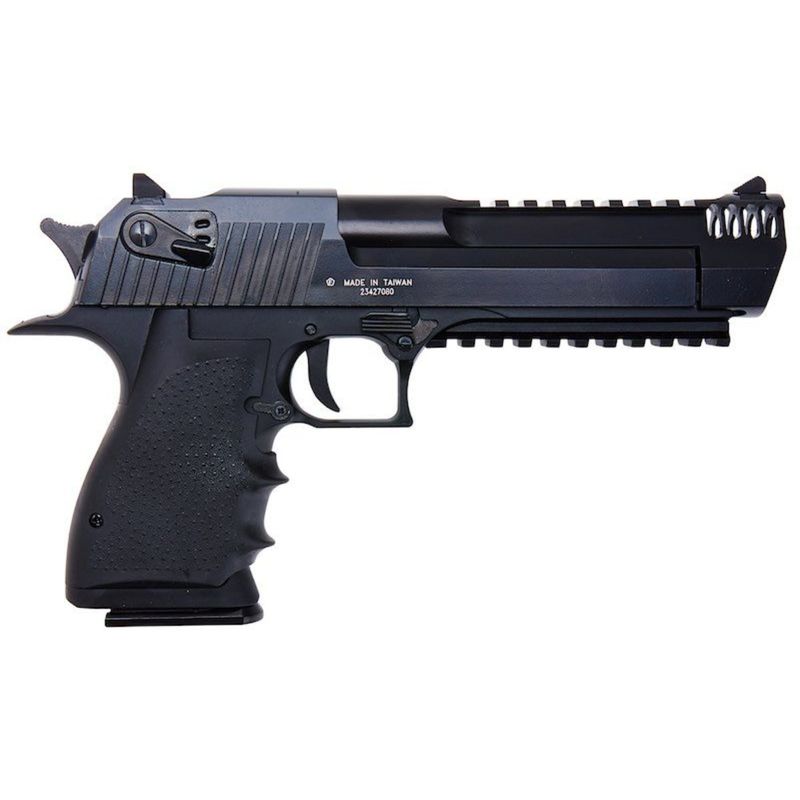 Licenciada pela Magnum Research e produzida por fabricantes reconhecidos como KWC / Cybergun, esta réplica apresenta slide metálico de grande curso, serrations frontais e traseiras para fácil manipulação e um recuo marcante proporcionado pelo sistema CO2 — resultando em uma experiência de tiro envolvente e com forte retorno tátil.