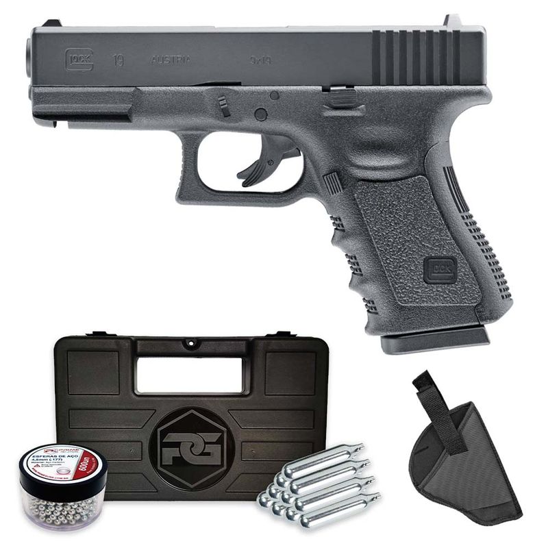 A Glock 19 da Umarex é uma pistola de pressão que dispara esferas de aço no calibre 4,5mm (.177), pertencendo à categoria airgun, pois dispara munição metálica e não esferas plásticas como no airsoft.