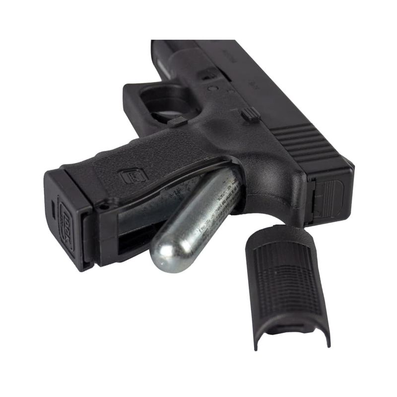 O magazine tem capacidade para 16 esferas de aço 4,5mm (.177). Apesar de não suportar chumbinhos, o magazine possui a base com marcação Glock, garantindo um visual fiel.