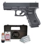 A Glock 19 da Umarex é uma pistola de pressão que dispara esferas de aço no calibre 4,5mm (.177), pertencendo à categoria airgun, pois dispara munição metálica e não esferas plásticas como no airsoft.