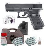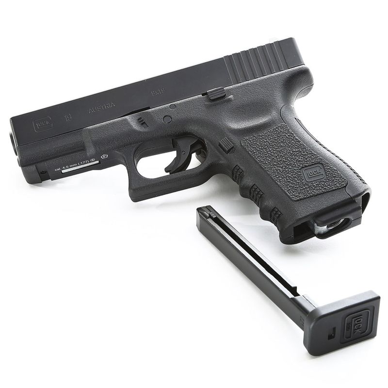 A Glock 19 da Umarex é uma pistola de pressão que dispara esferas de aço no calibre 4,5mm (.177), pertencendo à categoria airgun, pois dispara munição metálica e não esferas plásticas como no airsoft.
