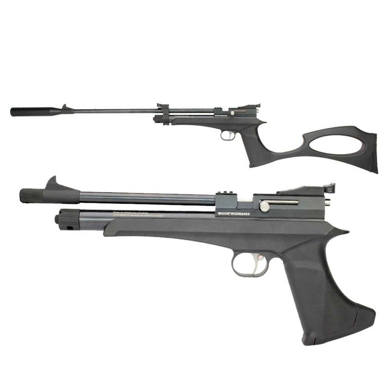 A CP2 da Artemis é uma pistola híbrida. No modo pistola ela bate 400fps - 122m/s, e montada como carabina ela alcança 510fps (153m/s).