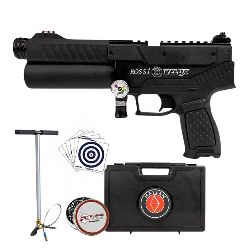 Construída em metal e polímero de alta resistência, a Hatsan Velox é uma pistola compacta e leve, pesando apenas 1,3 kg e com um comprimento total de 290 mm, o que facilita o manuseio e transporte. O cano de 140 mm é revestido em polímero, garantindo durabilidade e precisão. A pistola ainda vem equipada com trilho Picatinny de 11 mm e 22 mm, possibilitando a instalação de acessórios como lunetas e outros itens de customização.