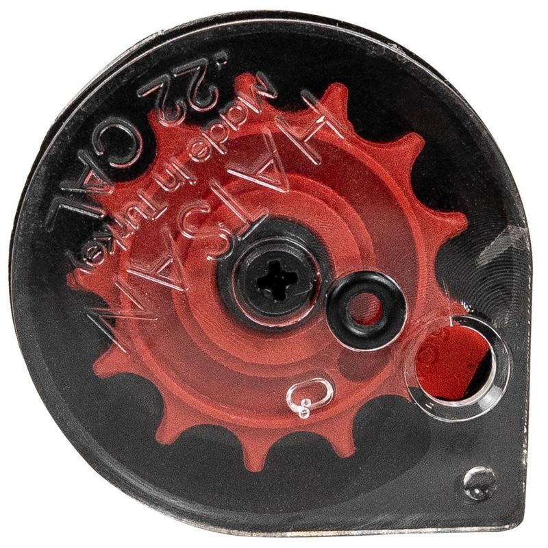 A HT Velox 5,5mm PCP da Hatsan dispara no modo manual, com carregador de 12 chumbinhos, precisando ser armada a cada tiro com alavanca lateral.