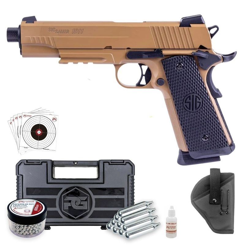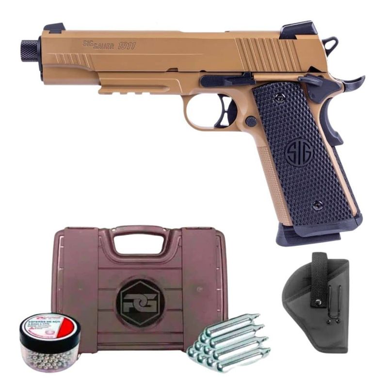 A pistola de CO2 Sig Sauer 1911 Emperor Scorpion 4.5mm Desert é uma reprodução fiel da arma de fogo, proporcionando uma experiência o mais próxima possível da original sem a necessidade de adquirir munição calibre 45 Auto. Com velocidades de até 300 fps, esta pistola é uma excelente forma de praticar para a versão de cano curto sem precisar ir até um estande de tiro, oferecendo diversão tanto para plinking quanto para prática de alvo.