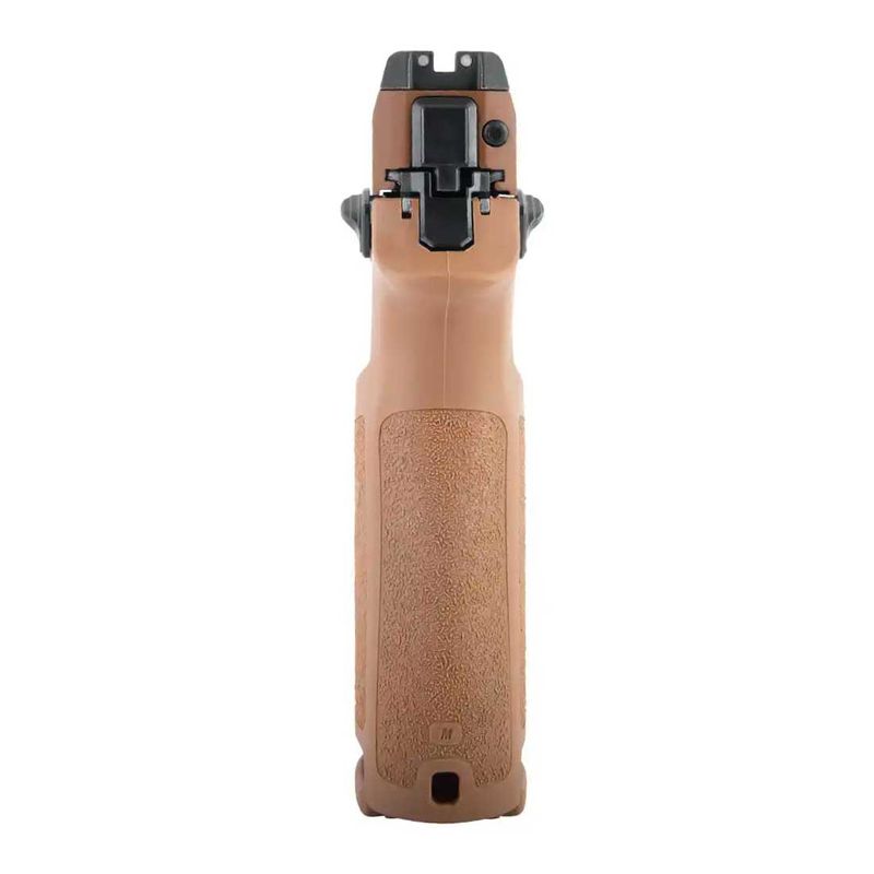 Seu slide Optics Ready, compatível com o red dot ROMEO1 PRO, possui acabamento Coyote PVD assim como o grip, ambos replicando fielmente o modelo militar.