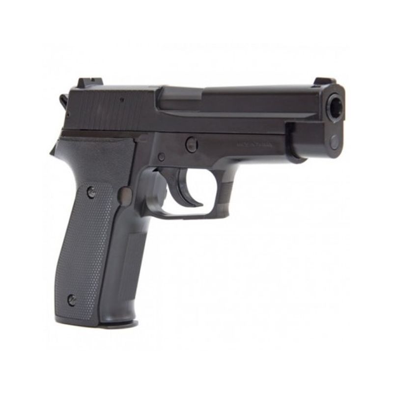 A Pistola Sig Sauer P226 Mola da Cyber Gun é uma pistola de mola que não exige cilindros de co2, gás ou outro propulsor para funcionar. Basta puxar o ferrolho/slide da arma para trás para atiras as esferas de aço 4,5mm