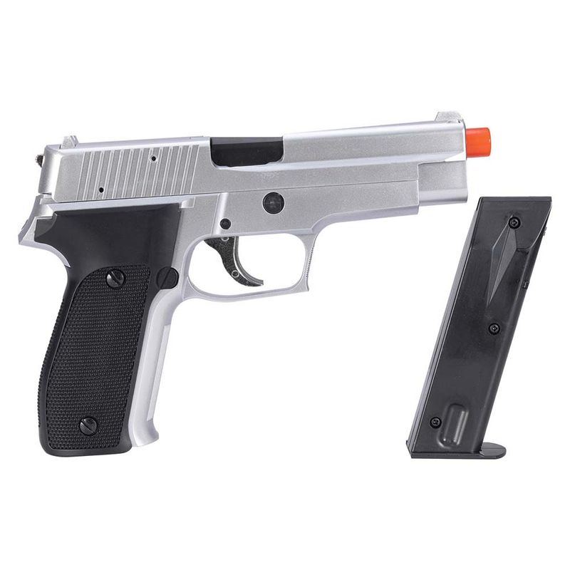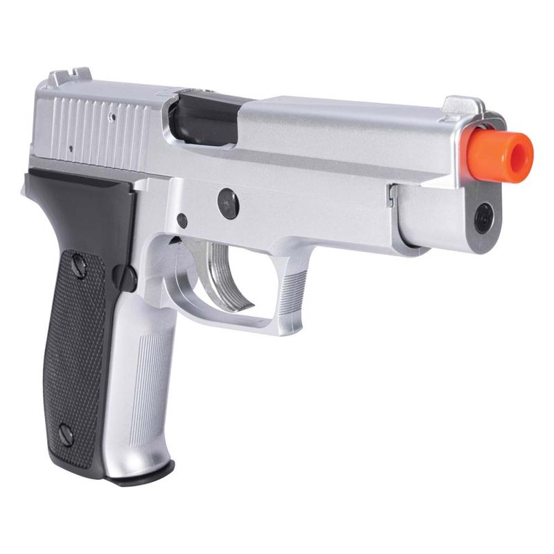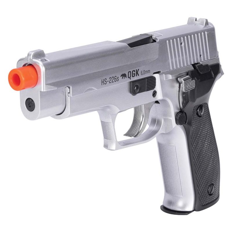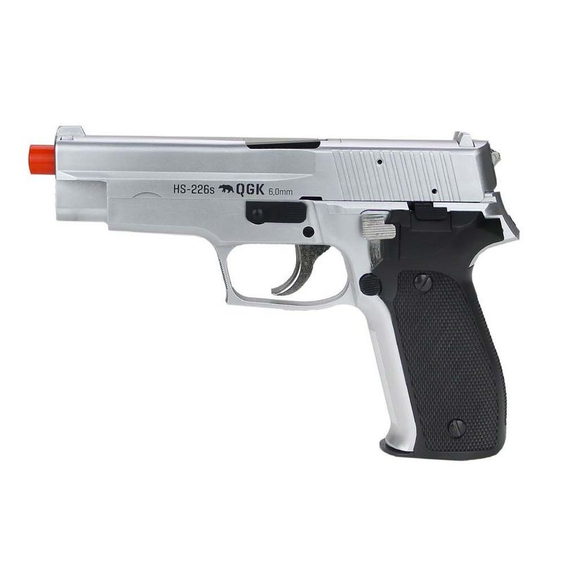 A pistola spring QGK HS-226S Cromada (Sig Sauer P226) é uma airsoft que dispara BBs de plástico no calibre 6mm. Ela é fabricada em polímero ABS de alta densidade e possui ação por mola.