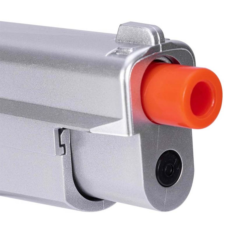 Seu magazine confeccionado em metal tem capacidade para 27 BBs. Atinge uma velocidade de disparo de 210 FPS com BBs de 0,12g.