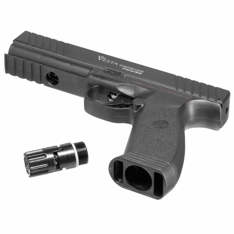 A Pistola Rossi Vesta PDW 50 oferece um compartimento interno para 6 esferas (bolas de borracha ou outras), colocadas diretamente abaixo do cano.