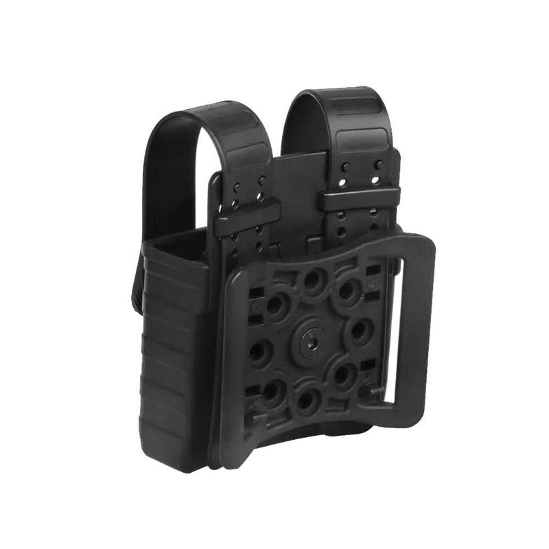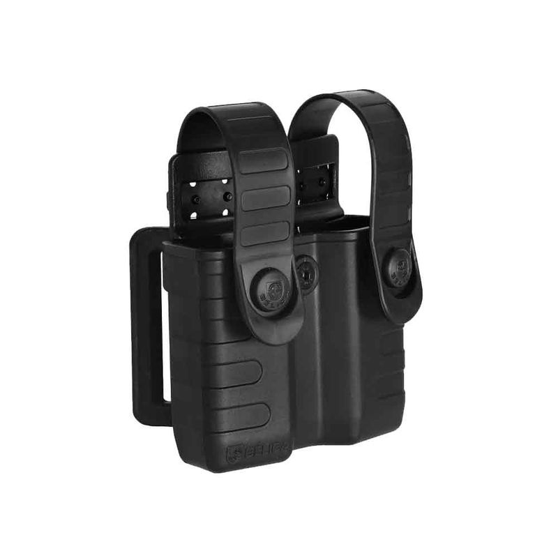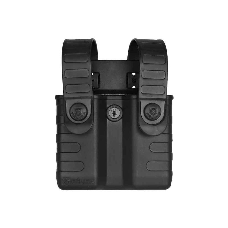 O Porta Carregador Duplo da Bélica Militar é fabricado em polímero de alta densidade, conta com o sistema Tab Lock (aba de retenção regulável), que permite ajustar o tamanho da lingueta conforme o carregador. Além de seu externo de alta qualidade, permite o transporte e o rápido saque do carregador.