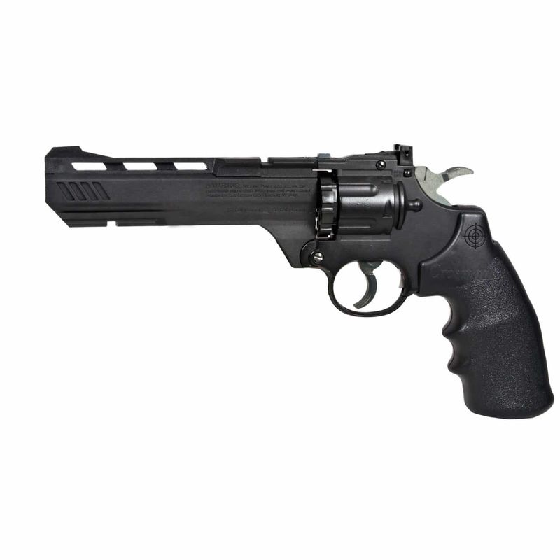 Um revólver leve e versátil, o Crosman CO2 Vigilante possui um design simples, porém marcante, com aberturas no cano.