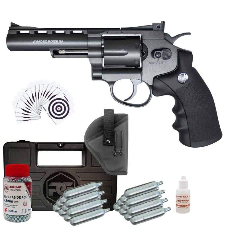 Este Revólver Airgun Rossi M701 Full Metal Co2 4,5mm Super Kit dispara no modo Repetição com velocidade de 370fps - 113m/s e energia de 2,3 Joules Ver mais