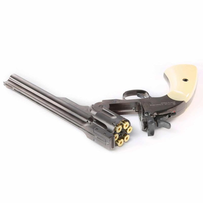 A cápsula de CO2 também pode ser inserida de maneira rápida e fácil: a empunhadura esquerda é simplesmente empurrada para cima e a cápsula de CO2 pode ser inserida. A empunhadura é então pressionada na empunhadura. O revólver de pressão de ar ASG Schofield de 6 polegadas possui um sistema de gatilho de ação única e uma mira fixa.