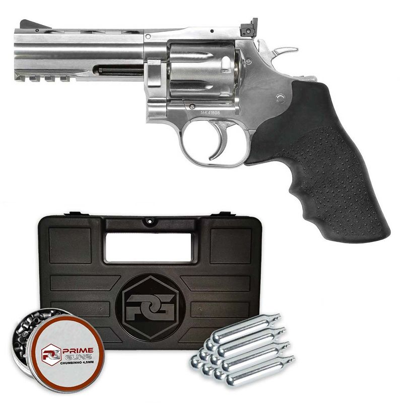 A Verdade é que ele possui todas as características como um revólver real, mas nesse caso, com propulsão de Co2 e que disparas chumbinhos 4,5mm (.177)