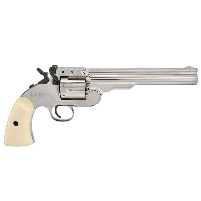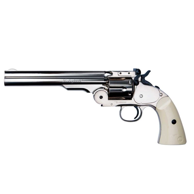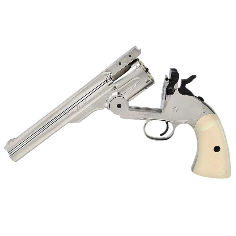 O revólver Schofield Silver de chumbinho é uma réplica fiel do famoso revólver Schofield, usado durante o Velho Oeste americano. Ele é alimentado por cápsulas de CO2 de 12g, que são inseridas no grip do revólver. O tambor tem capacidade para 6 tiros de chumbinho de 4,5mm.