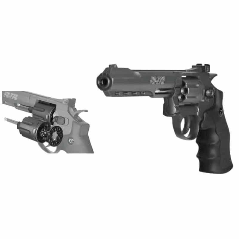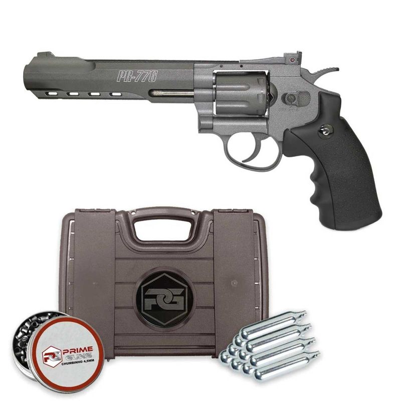 O revólver Gamo PR-776 é um revólver Airgun de chumbinho calibre 4,5mm (.177), que utiliza CO2 12g como propulsão, com capacidade para 8 tiros (acompanha 2 clips / magazines).