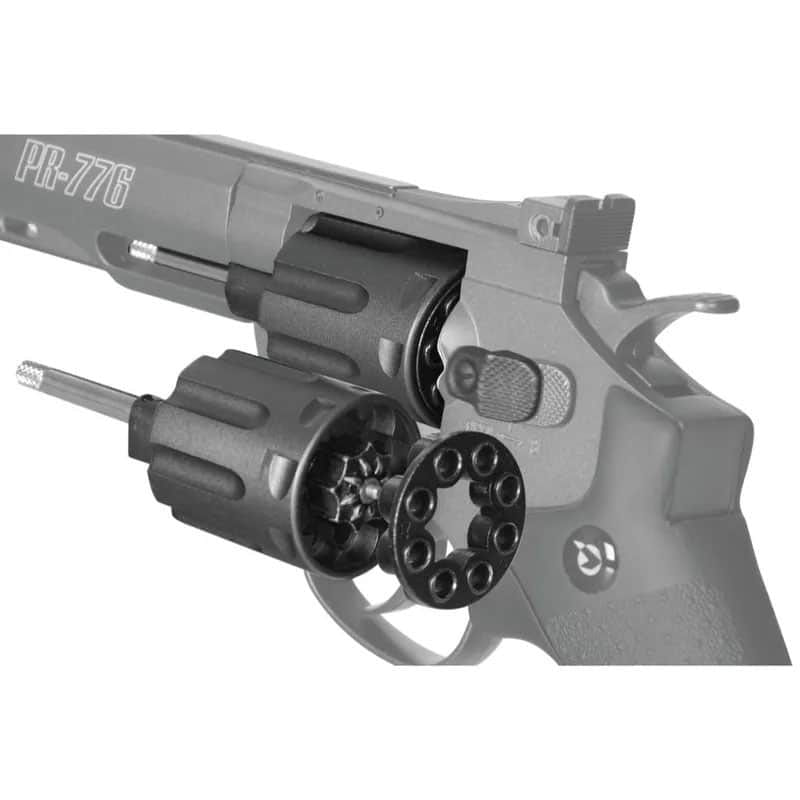 O Gamo PR-776 é um revólver de chumbinho que utiliza CO2 12g como propulsor e trabalha exclusivamente com um tambor de 8 tiros com clip de fácil carregamento.