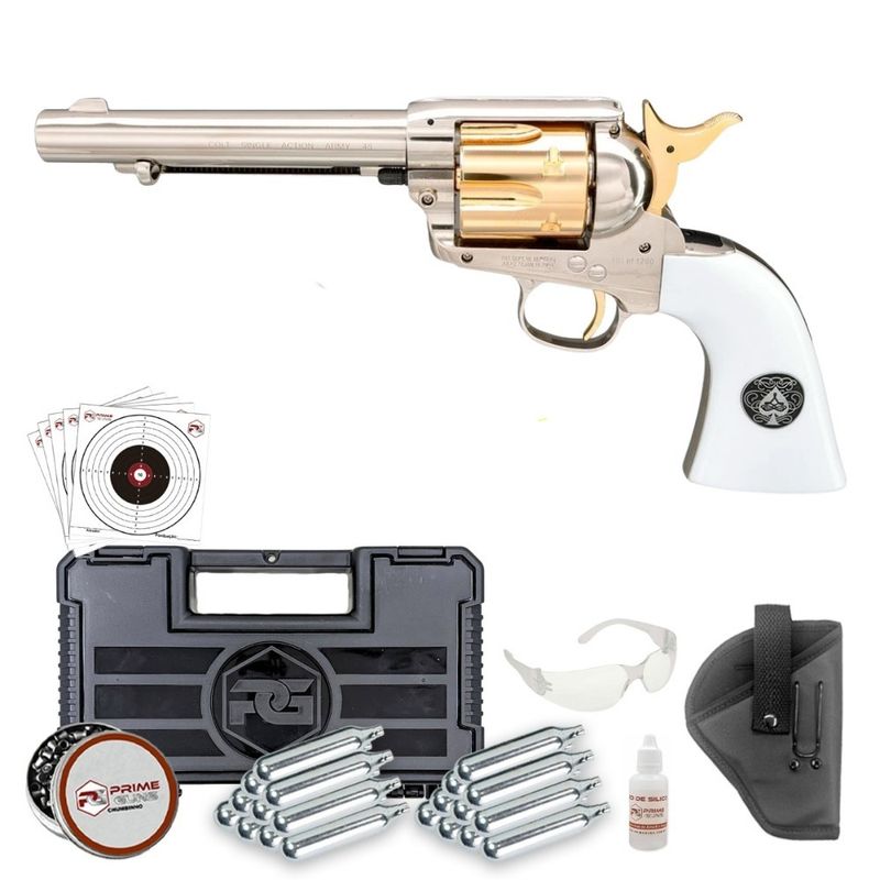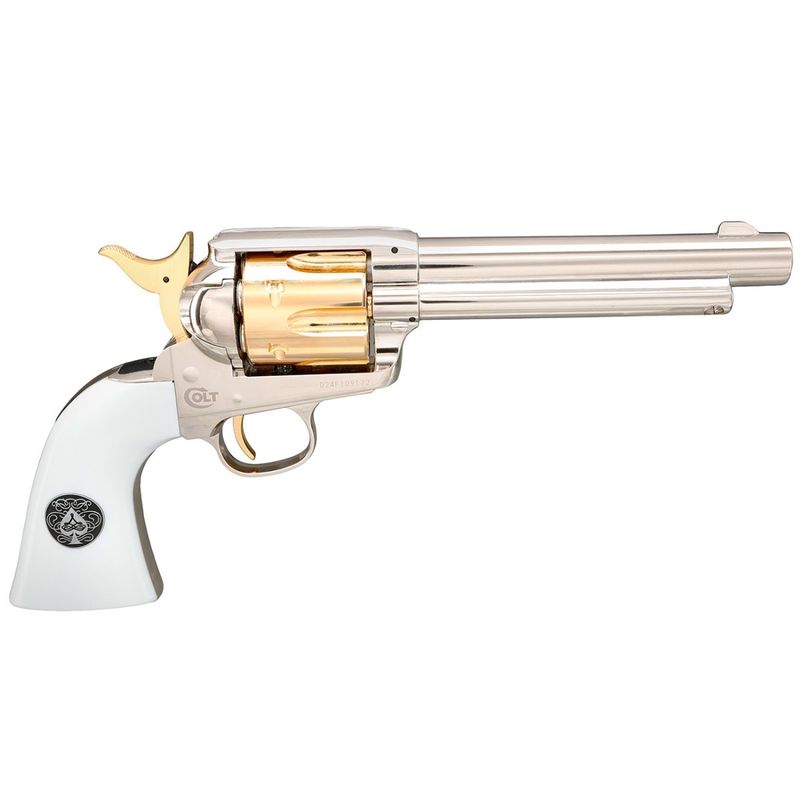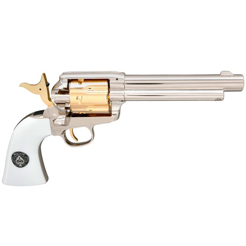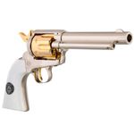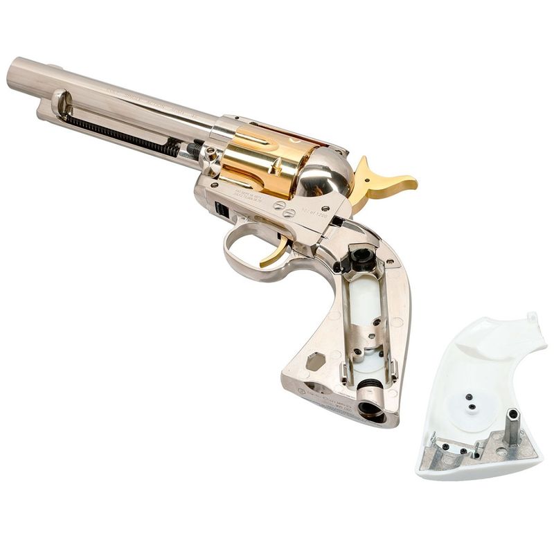 O brilho frio do níquel polido, combinado aos detalhes dourados do cilindro, cão e gatilho, transforma o Smoke Wagon em uma verdadeira peça de coleção. E não é só aparência: o cano raiado garante tiros precisos com Pellets 4,5mm, enquanto os cartuchos metálicos funcionais tornam o carregamento tão autêntico quanto no Oeste de 1873.