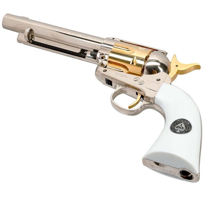 As munições são carregadas em cartuchos metálicos individuais, inseridos um a um no tambor, reproduzindo o mecanismo original do Colt Peacemaker.