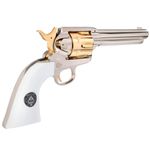 Revólver full metal com acabamento cromado e detalhes dourados, proporcionando peso e sensação de arma real (867 g).
