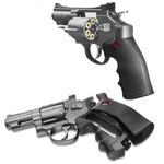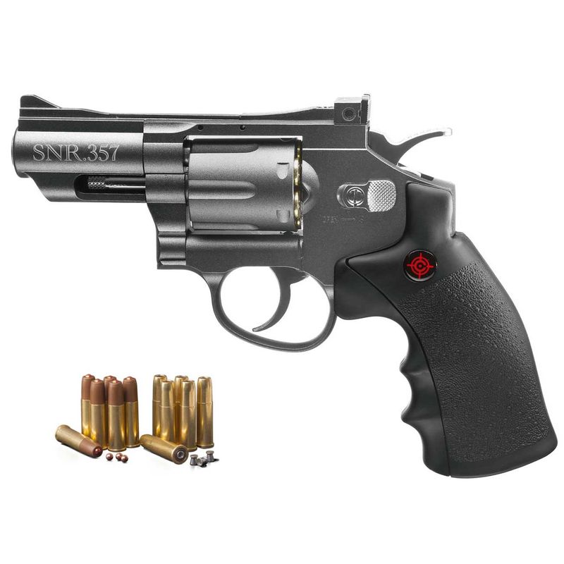 O revólver CO2 SNR-357 da Crosman vem no calibre 4,5mm e pode ser carregado tanto com BBs de aço quanto com chumbinhos (pellets).