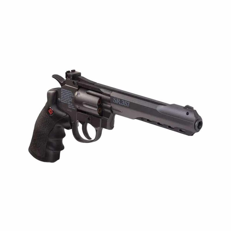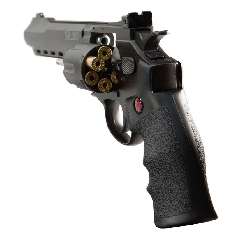 O SR357 Cromado utiliza cápsulas de CO2 de 12 g e possui um tambor rotativo com capacidade para 6 cartuchos metálicos reutilizáveis, que imitam perfeitamente munição real. Cada cartucho é carregado com esferas de aço calibre 4,5 mm.