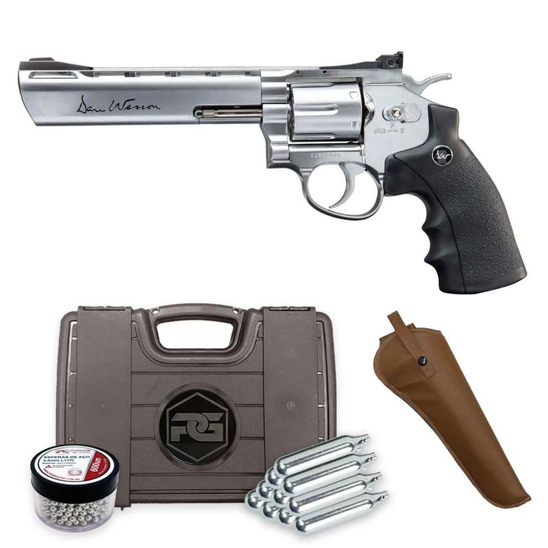 O revólver Dan Wesson possui um cano de 6 polegadas, acabamento cromado, alça de mira regulável, com opção de instalação de trilho superior de 22mm para Red Dot, e acompanha um Jet Loader com 6 cápsulas de metal (inclusas).
