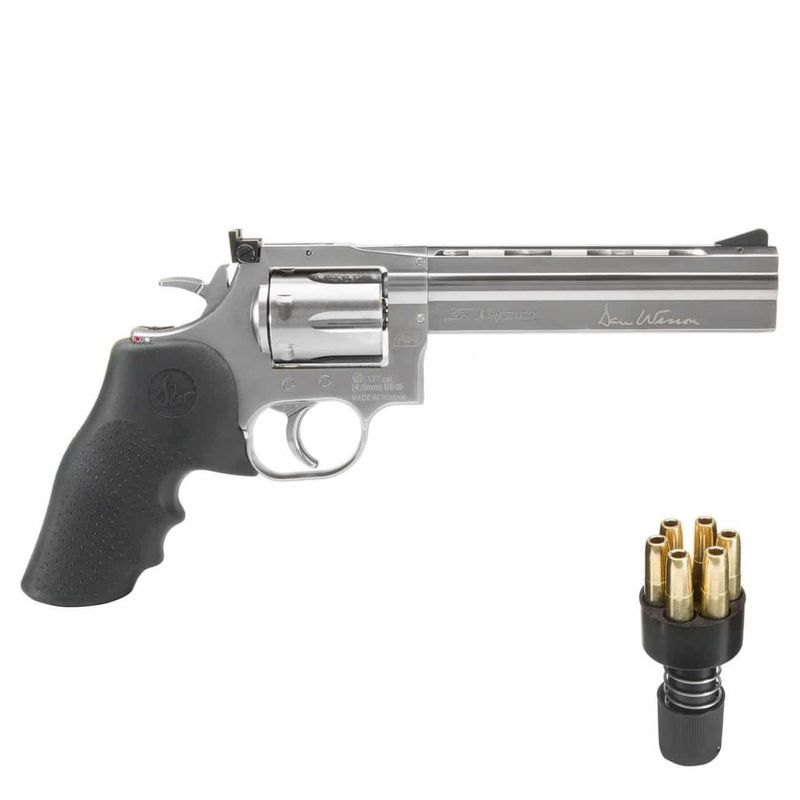 Este Revólver Dan Wesson 715 6" Cromado 4,5mm Full Metal dispara no modo Repetição com velocidade de 426fps - 130m/s e energia de 3 Joules Ver mais