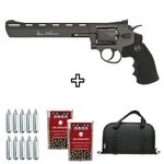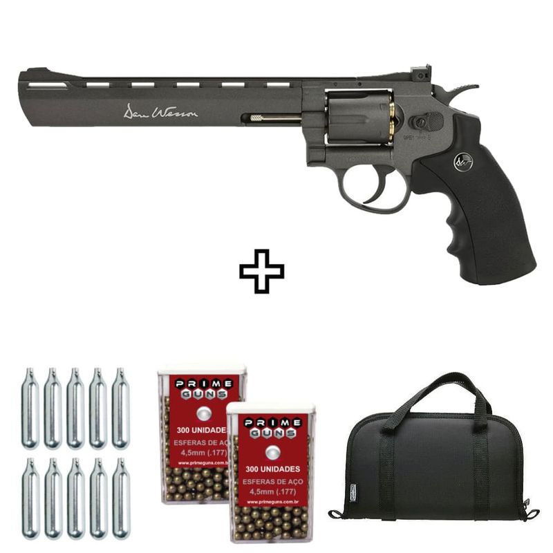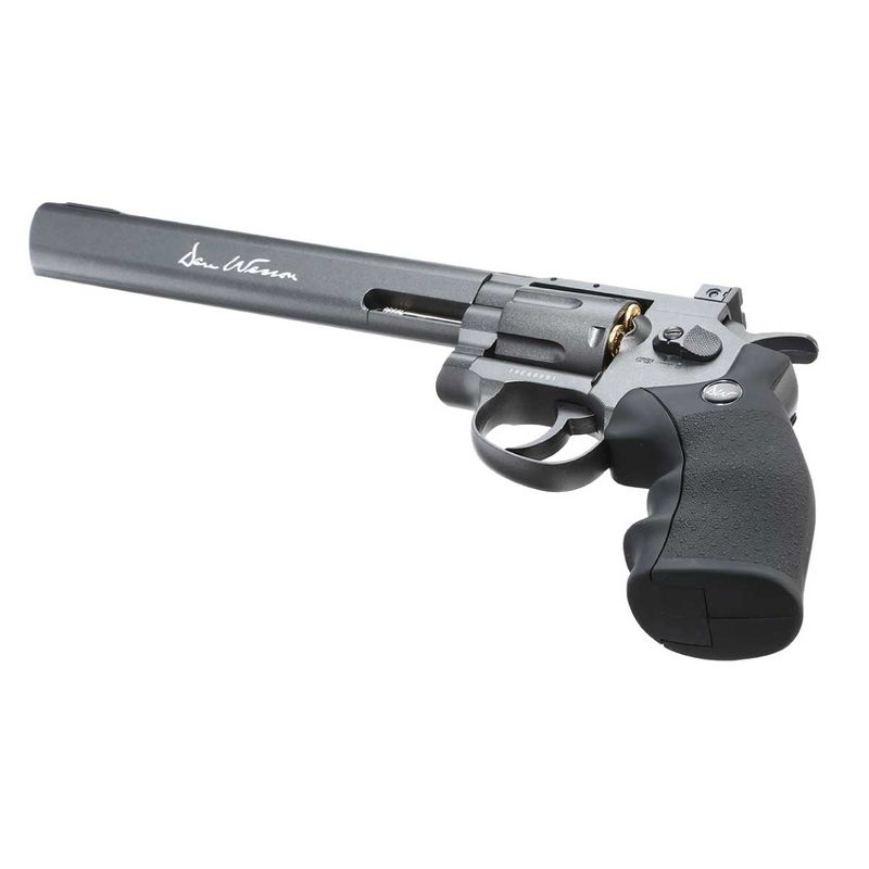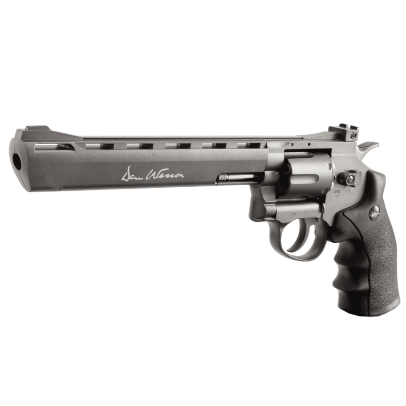 Fabricado todo em metal (Full Metal), o revólver Dan Wesson 8" possui cano de 8 polegadas, com acabamento preto e as marcações reais Dan Wesson. Possui também capacidade para 6 esferas de aço, que vão na ponta dos cartuchos de revólver destacáveis e reaproveitáveis. O revólver de co2 possui todas as travas funcionais e funciona exatamente da mesma forma que um revólver original, com o tambor rotativo que abre para esquerda, cão móvel na função double e single action, empunhadura emborrachada com compartimento do Co2 12g, cano de alma lisa e dispara as esferas de aço calibre 4,5mm (.177) a uma velocidade superior a 420fps, com um rendimento surpreendente de mais de 60 tiros bons com um cilindro de co2.