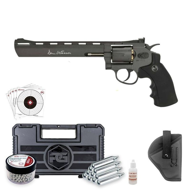 Este Revólver Dan Wesson 8" Black Co2 Full Metal 4,5mm + Coldre dispara no modo Repetição com velocidade de 420fps - 128m/s e energia de 145 Joules Ver mais
