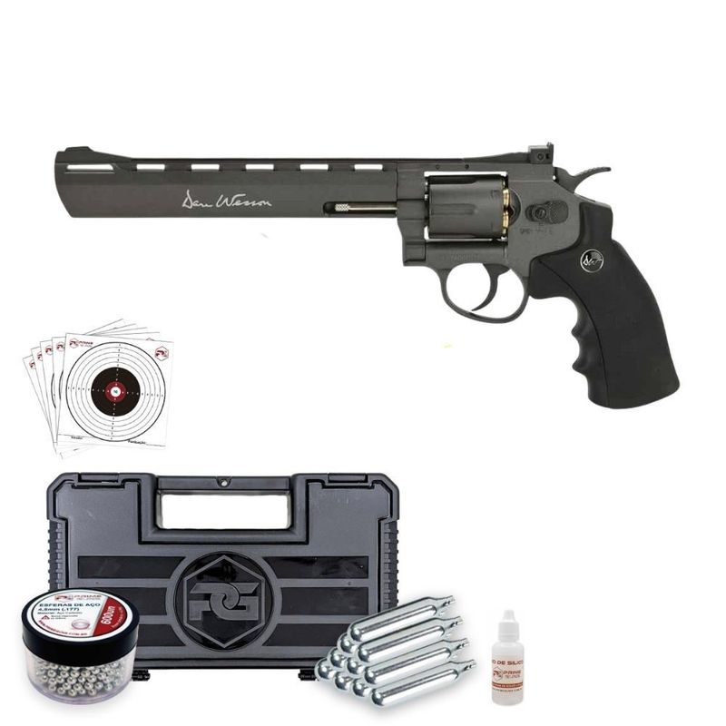 Este Revólver Dan Wesson 8" Black Co2 Full Metal 4,5mm Kit dispara no modo Repetição com velocidade de 420fps - 128m/s e energia de 145 Joules Ver mais