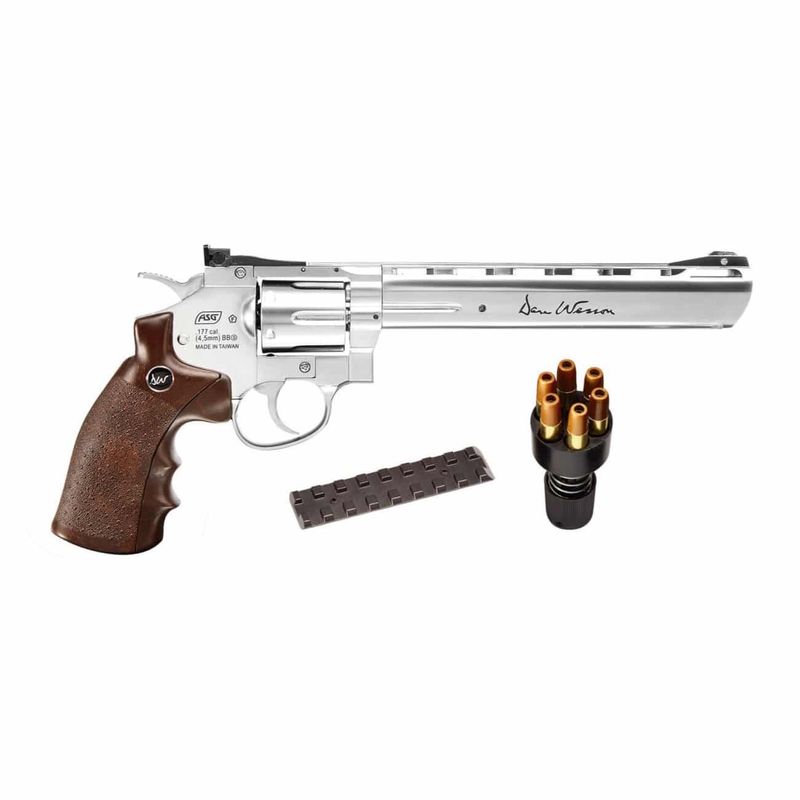 É impossível pensar em revólver airgun e não lembrar do clássico Revólver Dan Wesson 8" Cromado, da ASG.