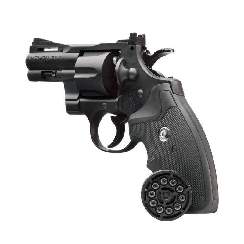 O Colt Python .357 acompanha 3 magazines rotativos para 10 chumbinhos ou esferas de aço 4,5 mm, com alma lisa.