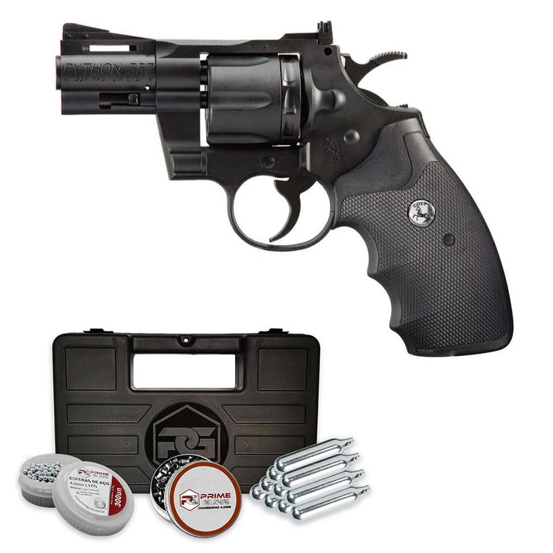 O Revólver Colt Python .357 CO2, no calibre 4,5 mm, oferece operação prática e desempenho consistente. Fabricado com corpo em polímero ABS resistente, possui componentes internos e peças móveis em metal, como cão, cano interno e gatilho, conferindo robustez e excelente acabamento.