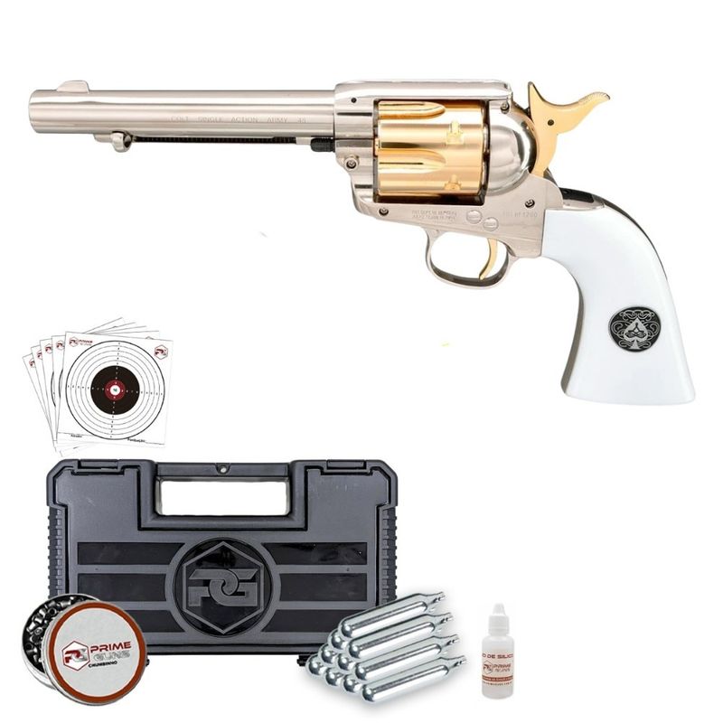 Este Revólver de Chumbinho Colt SAA Smoke Wagon Co2 .45 Kit dispara no modo Repetição com velocidade de 377fps - 115m/s e energia de 3 Joules Ver mais