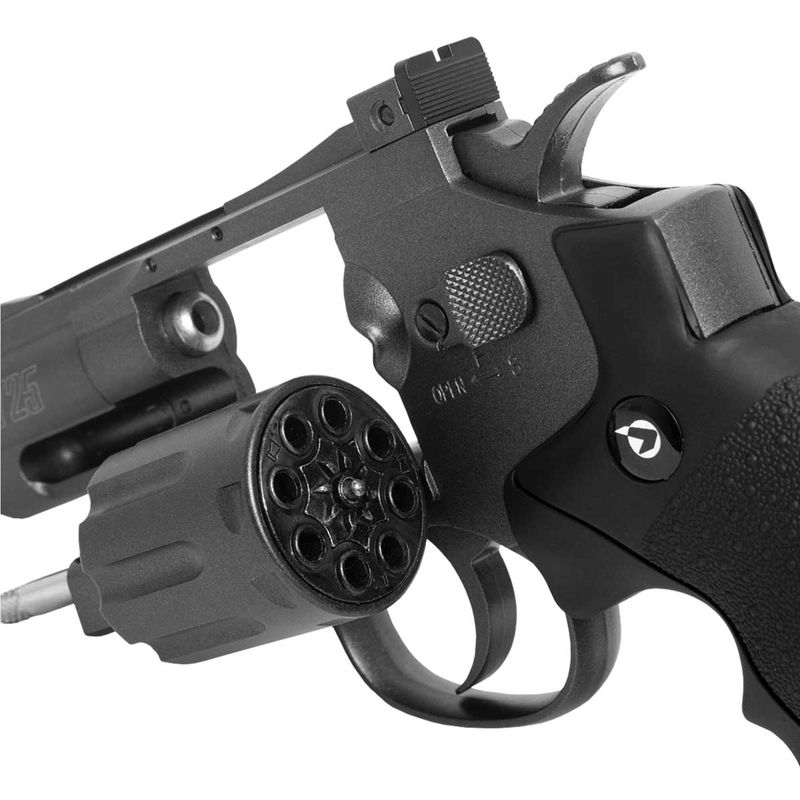 O tambor rotativo comporta 8 chumbinhos, permitindo recargas rápidas e maior autonomia de disparo.