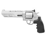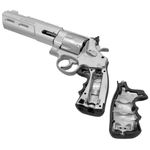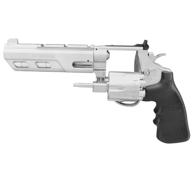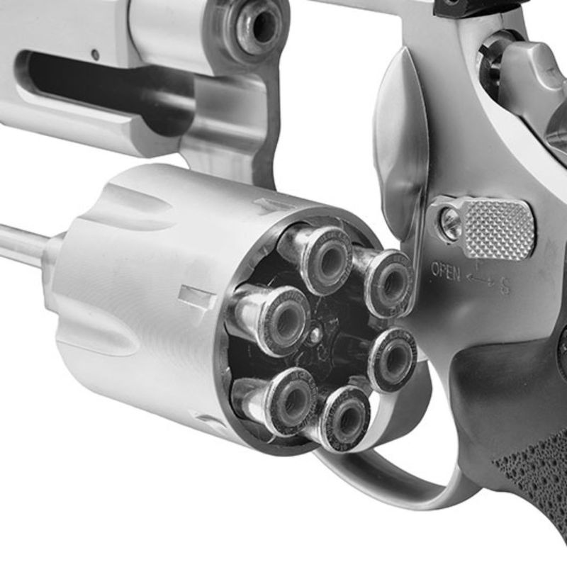 Construído inteiramente em full metal, o SW 629 Competitor transmite solidez e sensação realista em cada detalhe. Seu peso aproximado de 1.550 g é praticamente idêntico ao de um revólver real, reforçando a experiência autêntica de disparo. A empunhadura ergonômica emborrachada garante conforto e firmeza, mesmo em longas sessões de tiro, e esconde de forma prática o sistema de encaixe da cápsula de CO2 de 12 g, cuja ferramenta de perfuração já vem integrada no próprio grip. O funcionamento também é fiel ao original: o tambor de seis tiros é alimentado com cartuchos metálicos individuais, nos quais se inserem os chumbinhos calibre 4,5 mm (.177). Essa característica torna o processo de carregamento extremamente realístico e envolvente, elevando a imersão do atirador.