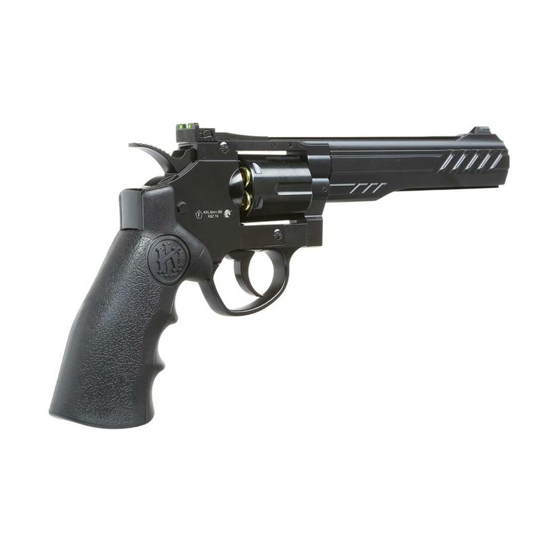 Apenas a alça em design de combate com logotipo KLI integrado é feita de plástico composto. Como muitos outros revólveres airsoft, esses modelos também são operados com cápsulas de 12g CO2 e possuem um sistema de disparo muito interessante com tambor desdobrável e caixas de cartucho.