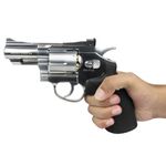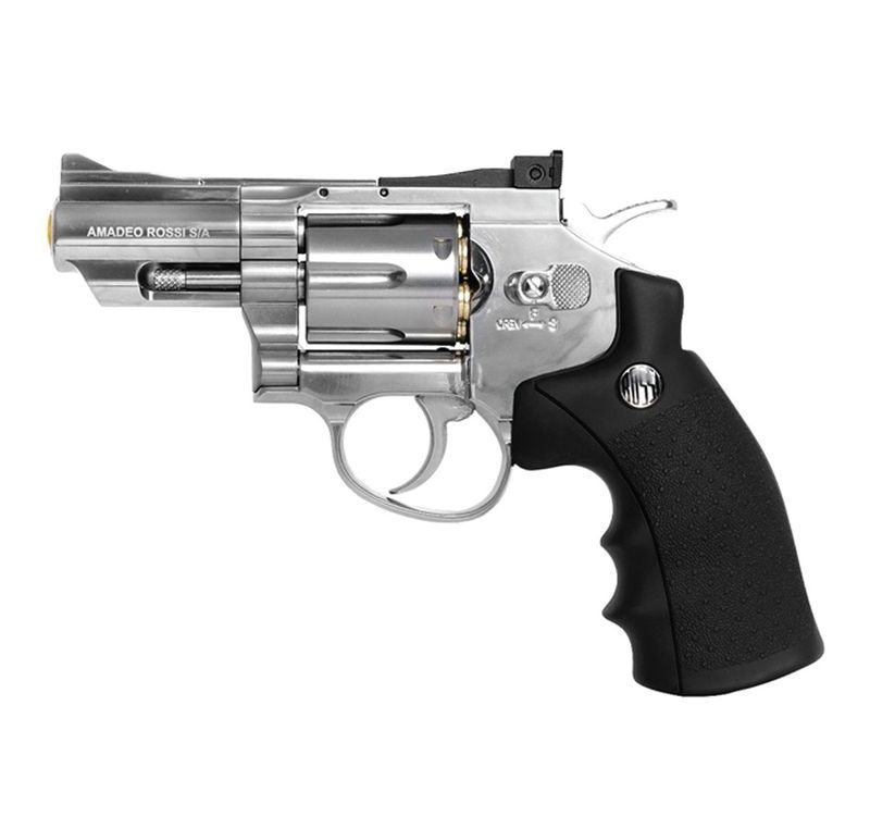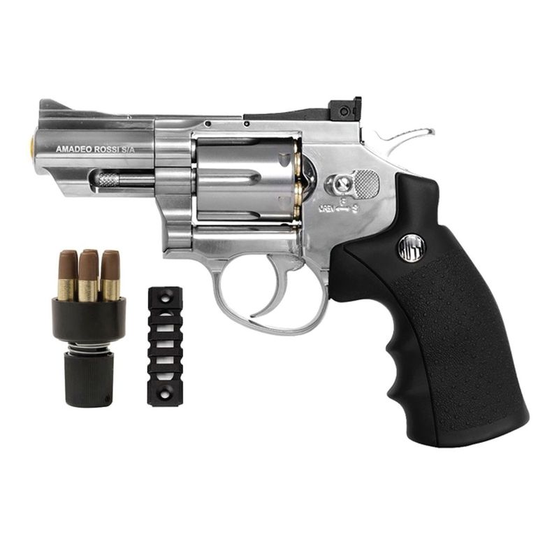 Este Revólver de Pressão Rossi 708S Cromado CO2 4,5mm dispara no modo Repetição com velocidade de 400fps - 122m/s e energia de 1,8 Joules Ver mais